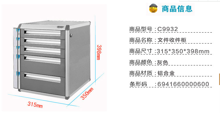 金隆兴C9932铝合金带锁抽屉文件柜 五层整理资料柜