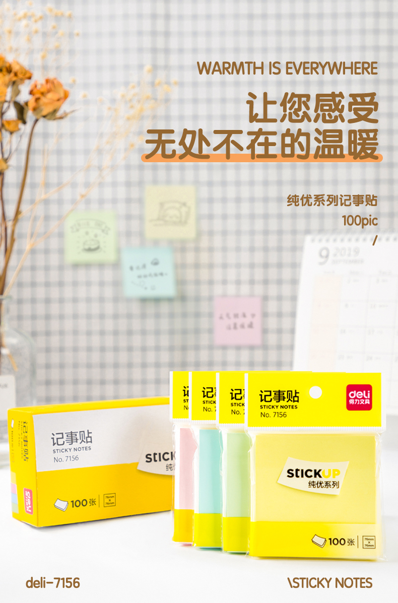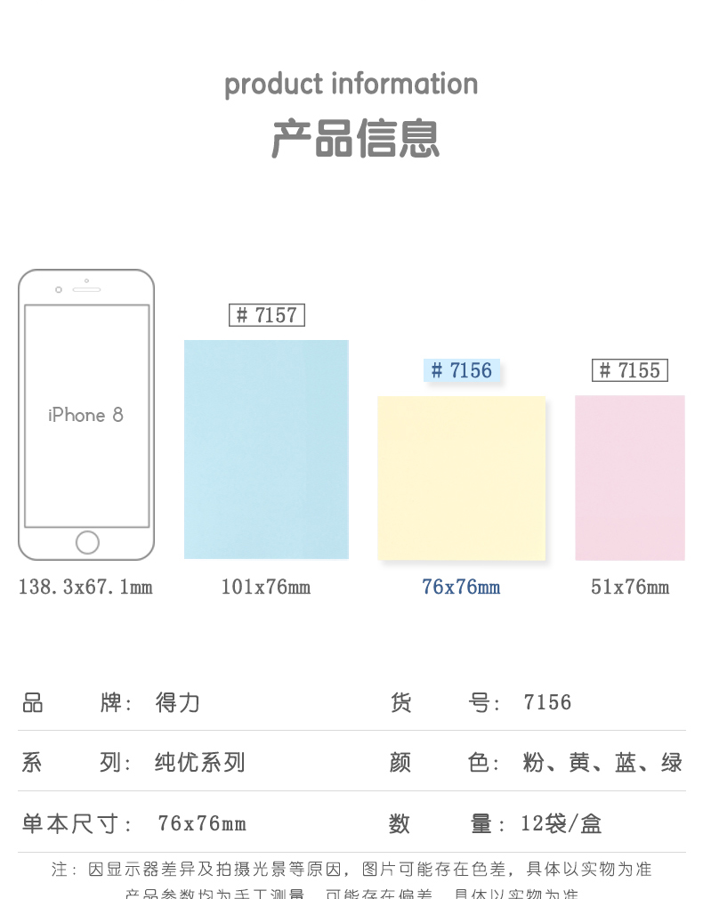 >得力(deli)12本彩色便利贴粘性便签纸 7676mm备忘留言纸记事贴N次贴办公用品 7156