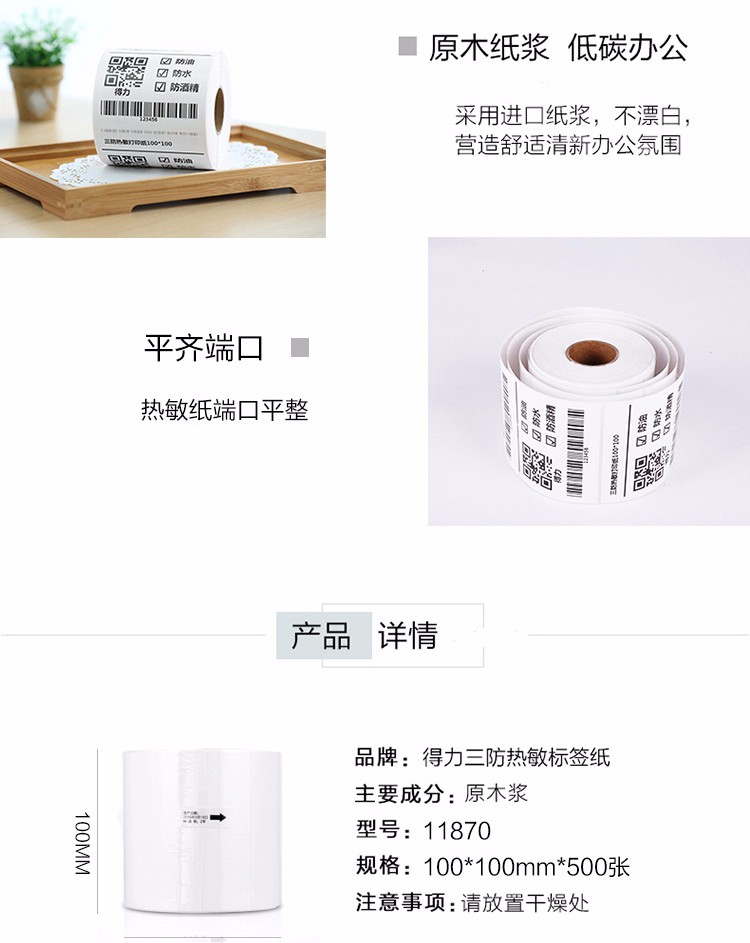 得力(deli) 三防热敏标签纸 电子面单不干胶打印纸 条码纸 热敏纸 100100mm 500张 11870