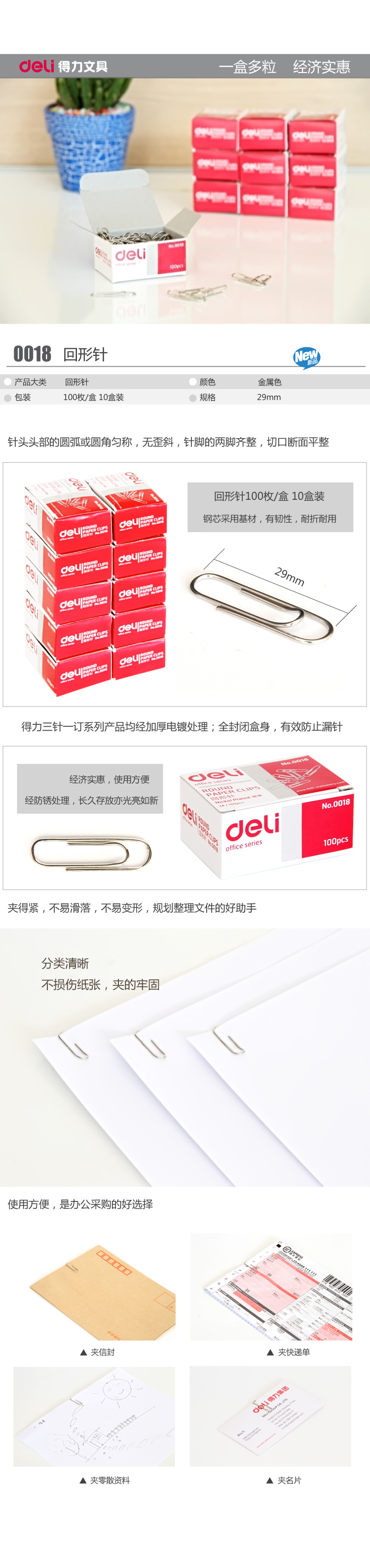 >得力0018回形针金属镀镍回形针3#100枚曲别针办公用品文具