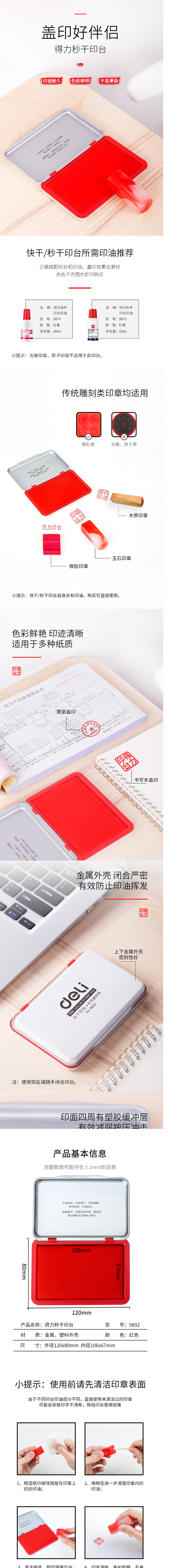 >得力(deli)方形中号秒干印台印泥 办公用品 红色9892