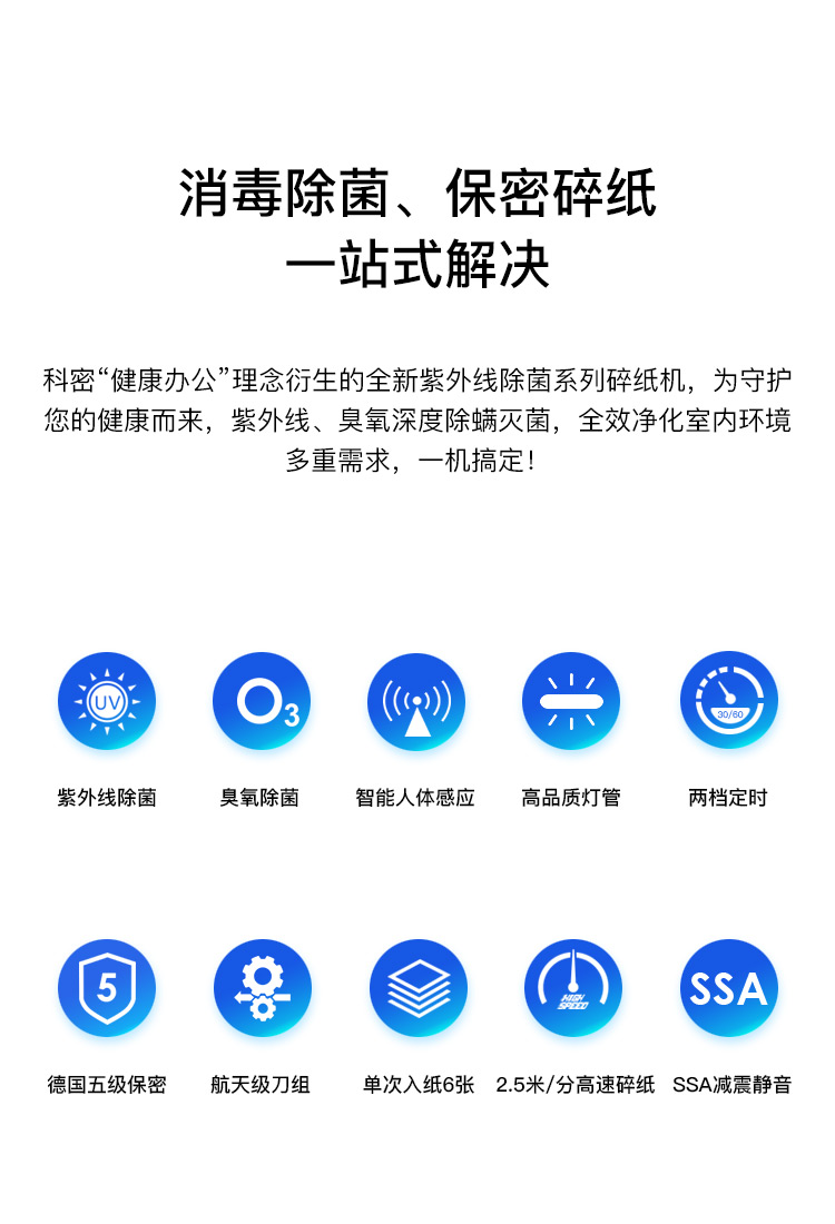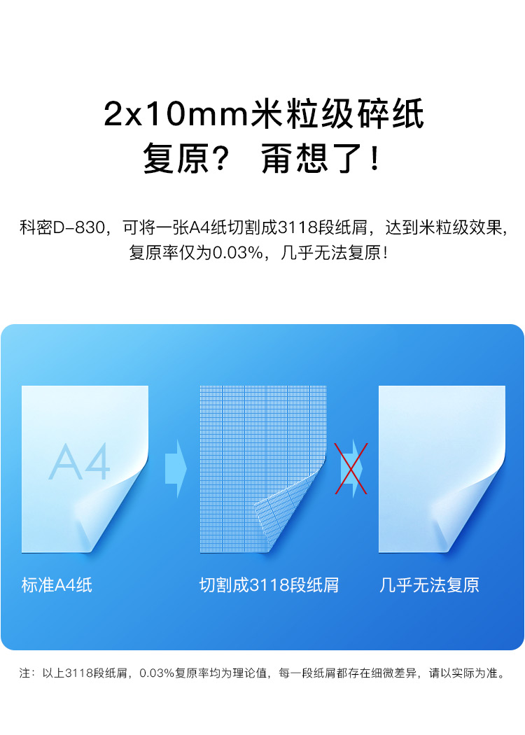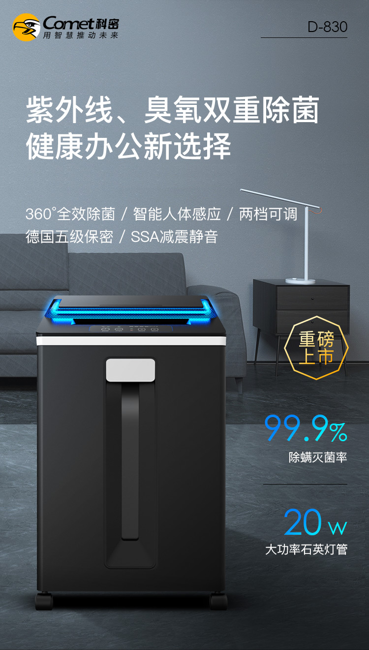 >科密(comet)碎纸机 D-830 紫外线臭氧除菌除螨 德国5级高保密减震静音办公 纸张文件粉碎机