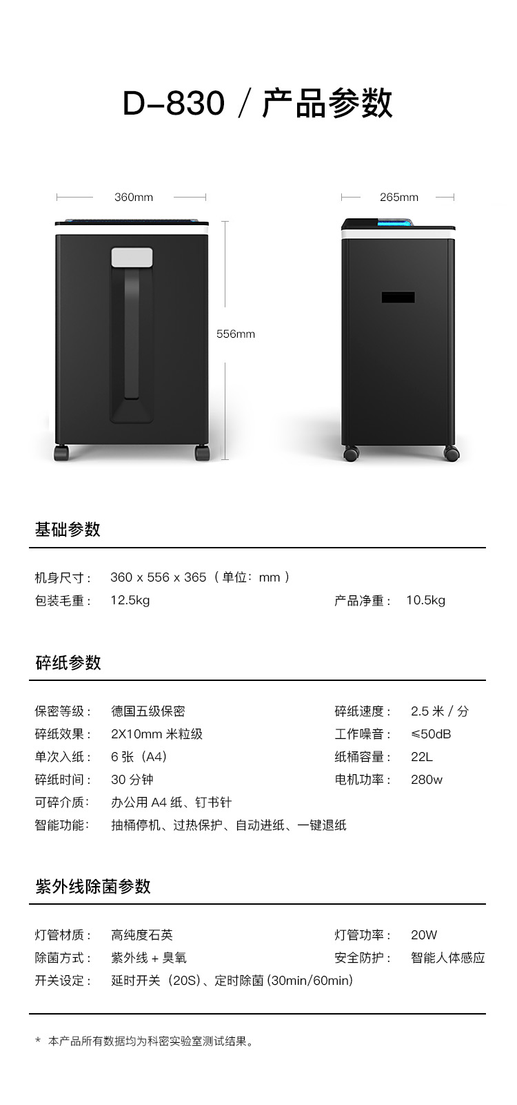 科密(comet)碎纸机 D-830 紫外线臭氧除菌除螨 德国5级高保密减震静音办公 纸张文件粉碎机