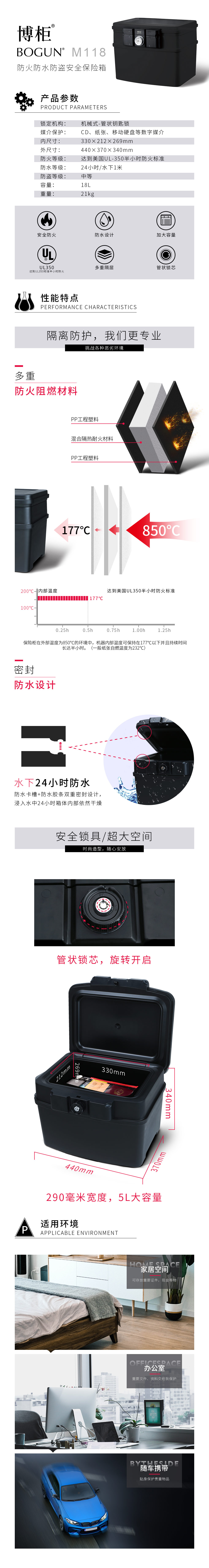 >博柜(BOGUN)M118机械式管状钥匙锁30分钟850℃防火24小时防水防盗小型便携保险箱