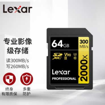 雷克沙(Lexar)64GB U盘存储类配件 读300MB/s 写260MB/s SDHC UHS-II U3 V90 SD高速存储卡(2000x)