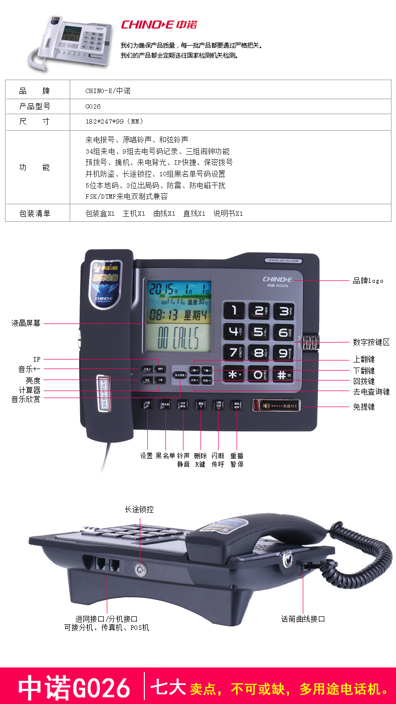 中诺 G026 电话机 家用商务办公免提报号座式有线座机来电显示黑名单