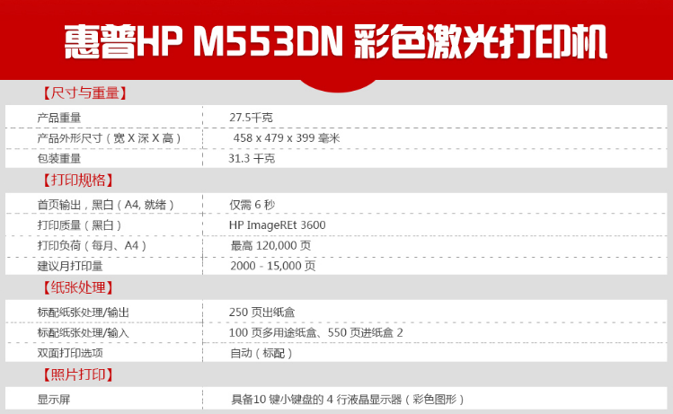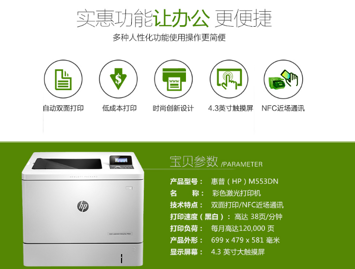 >惠普(HP) M553dn 激光打印机 A4工作组彩色 双面打印+有线网络