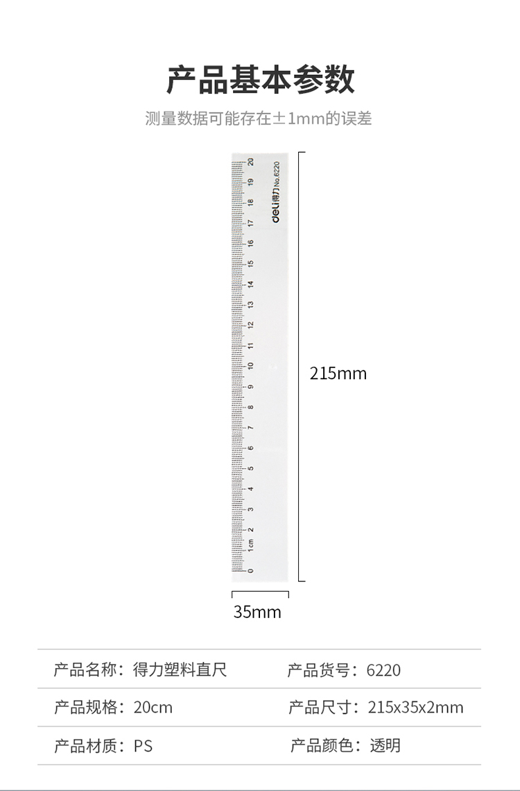 >得力(deli) 6220 各种尺 办公通用直尺 测量绘图尺子 办公用品 20cm
