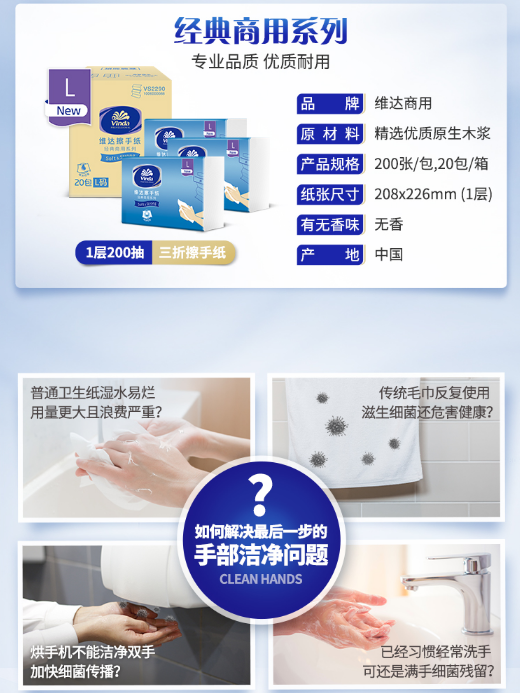 >维达(Vinda) VS2290 卫生间专用擦手纸 抽纸 200抽*20包擦手纸 L码大尺寸 酒店厨房餐厅卫生间可用纸巾208mm*226mm 整箱销售
