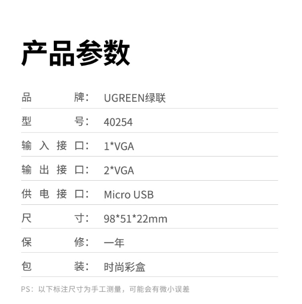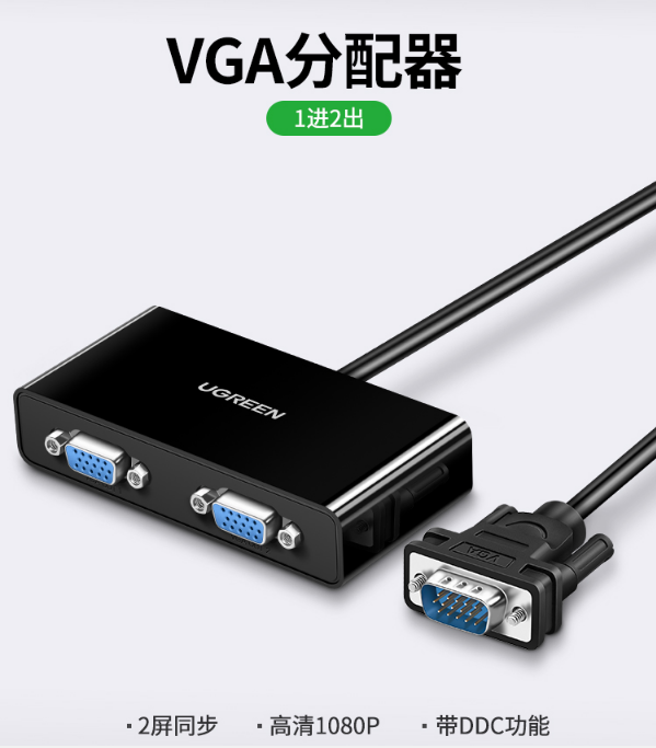 绿联(UGREEN)数据线类 40254 VGA分配器一分二 笔记本电脑显示器分屏器 高清视频转换器一进二出同屏器 1分2分频器