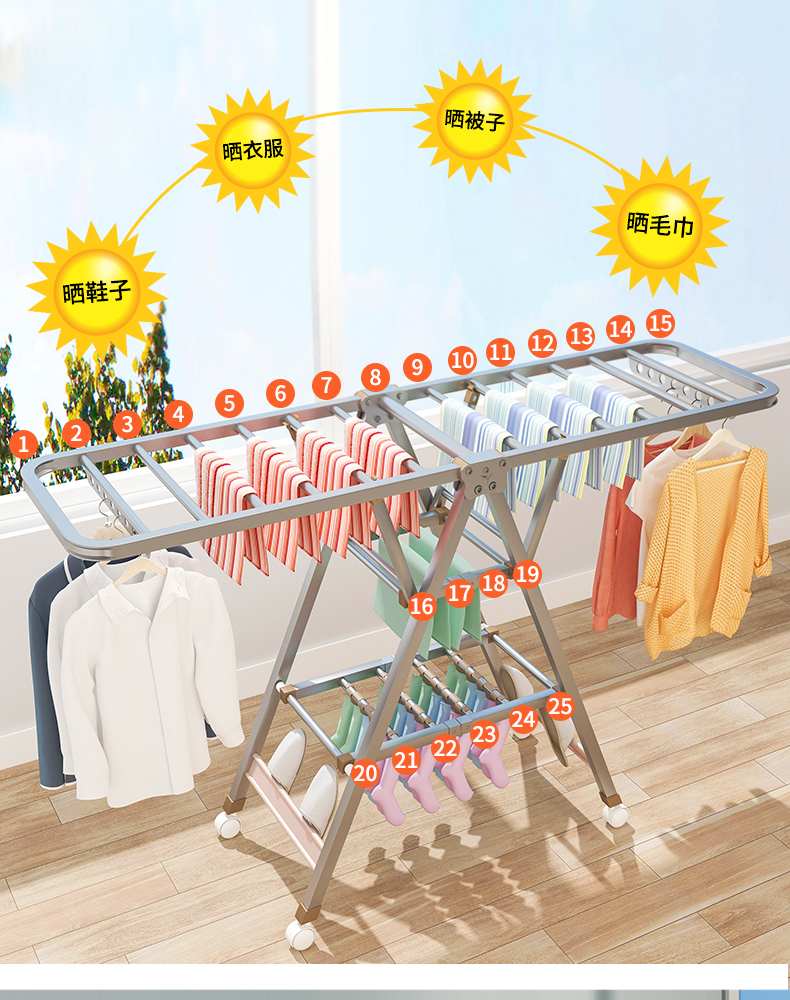 好太太 晾衣晒衣 HTT-120不锈钢晾衣架落地折叠卧室内阳台凉衣架家用婴儿晾衣架晒被子神器