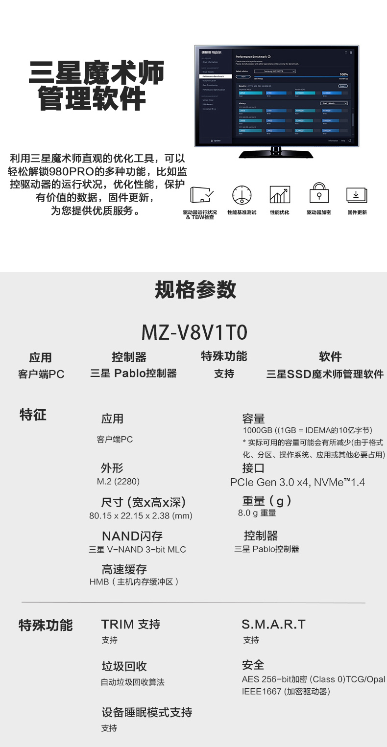 三星SSD 980 U盘存储类配件 固态硬盘1TB NVMe M.2笔记本台式机电脑存储PCIe3.0