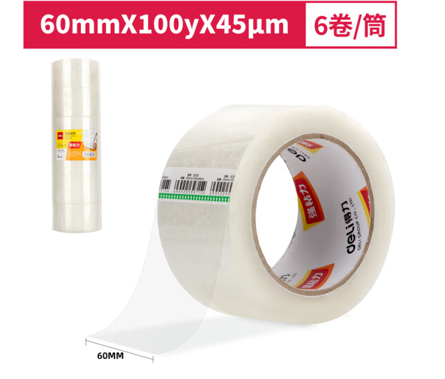 >得力(deli) 30333 胶带 60mm*100y*45u 高品质透明封箱胶带打包宽胶带 6卷/筒
