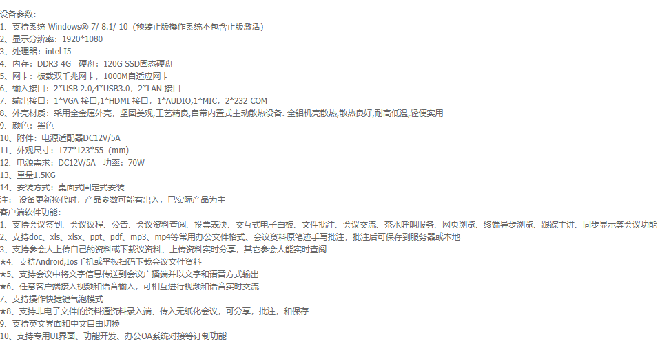 佳比(JUSBE)AH-920X 视频会议会议室终端 无纸化会议终端 内存:DDR36 4G 分辨率:1920*1080 120G SSD固态硬盘