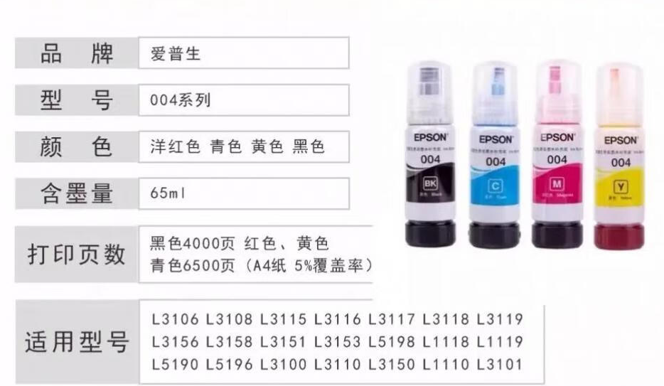 >爱普生(EPSON) 004 墨水/补充液/墨囊 适用于 L3153 L3151L3108 L3118 L3119 L3158 004 原装 青色