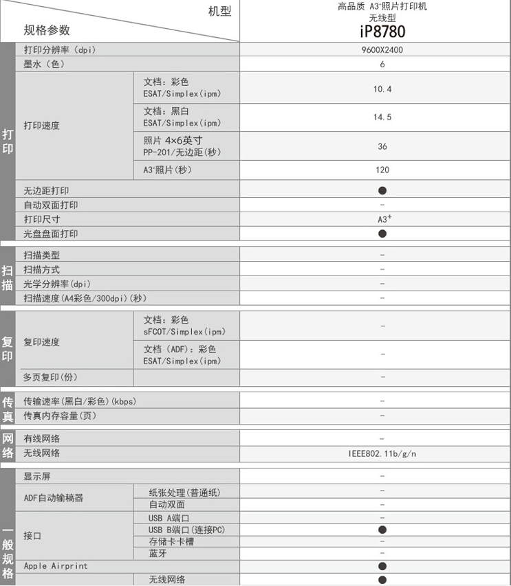佳能/CANON iP8780 A3 彩色打印机 A3+幅面无线彩色喷墨高品质照片打印机(6色独立式墨水)