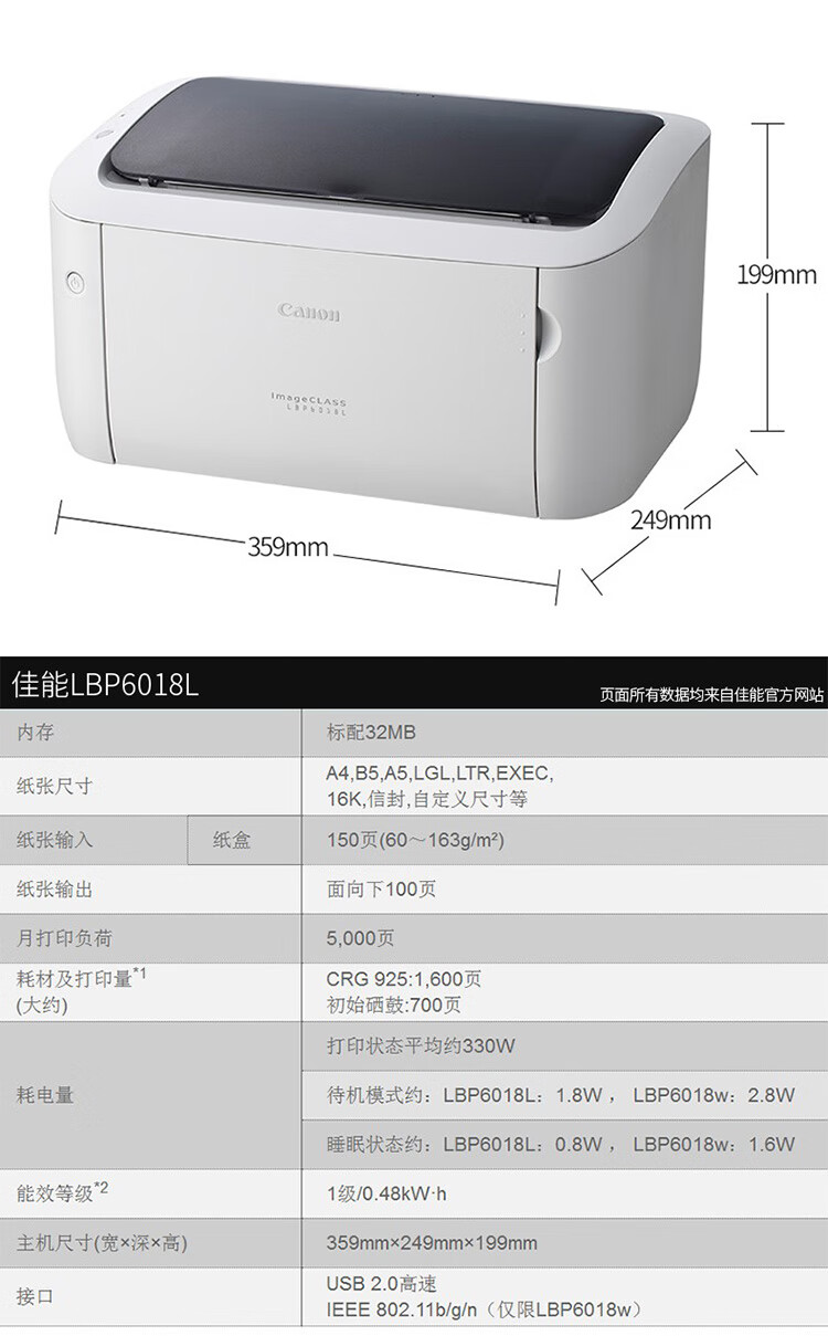 佳能(Canon)LBP6018w A4黑白打印机(快速打印/节能环保 家用/商用)WFI版