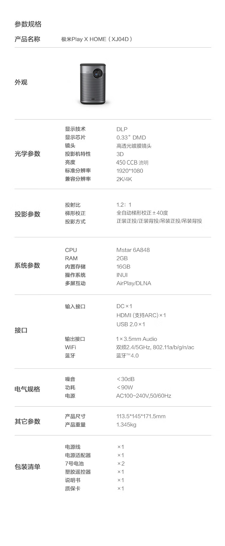 >极米 PlayXhome XJ04D 投影仪 1080P家用高清 便携+吊架+100寸电动幕布