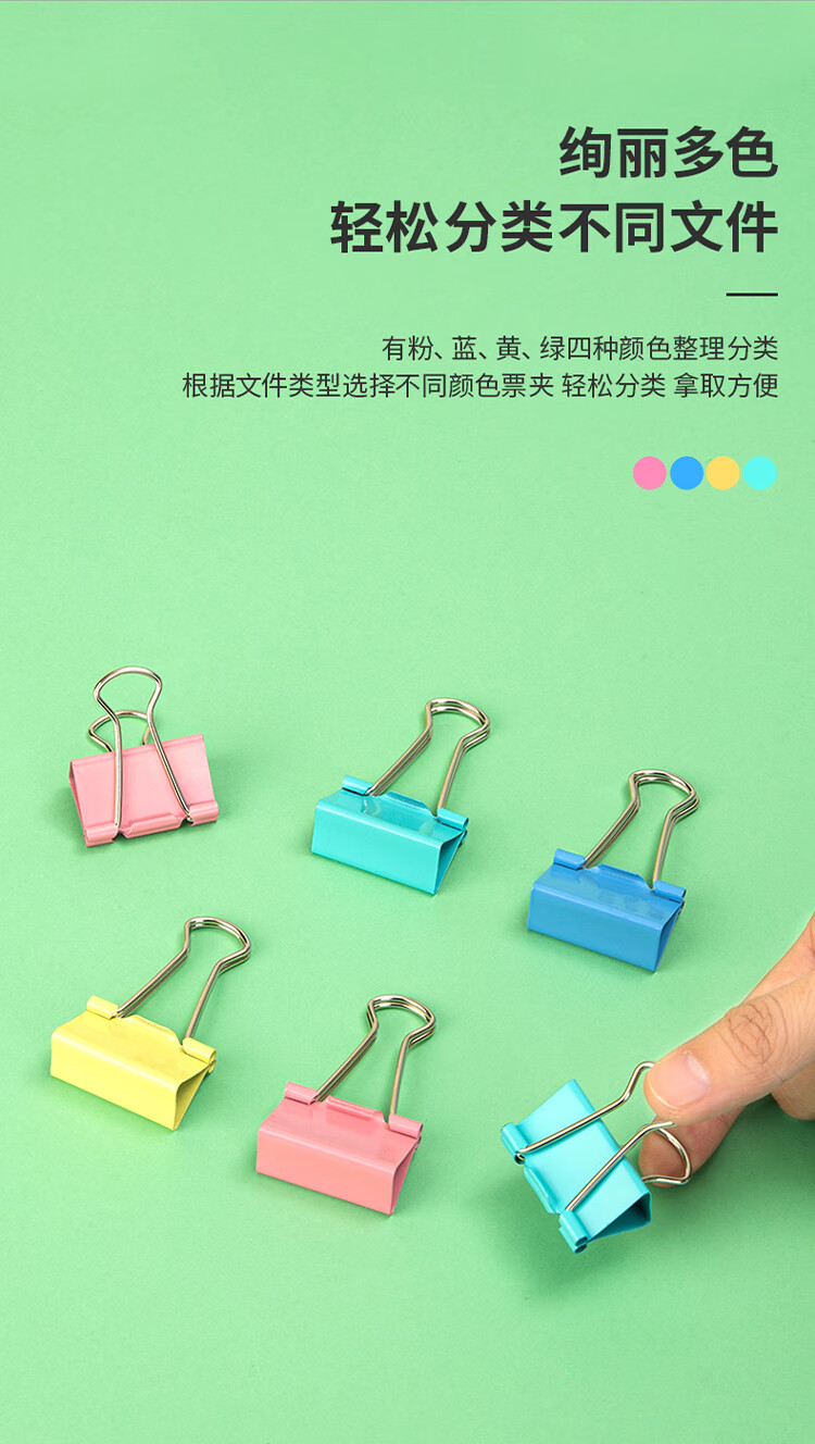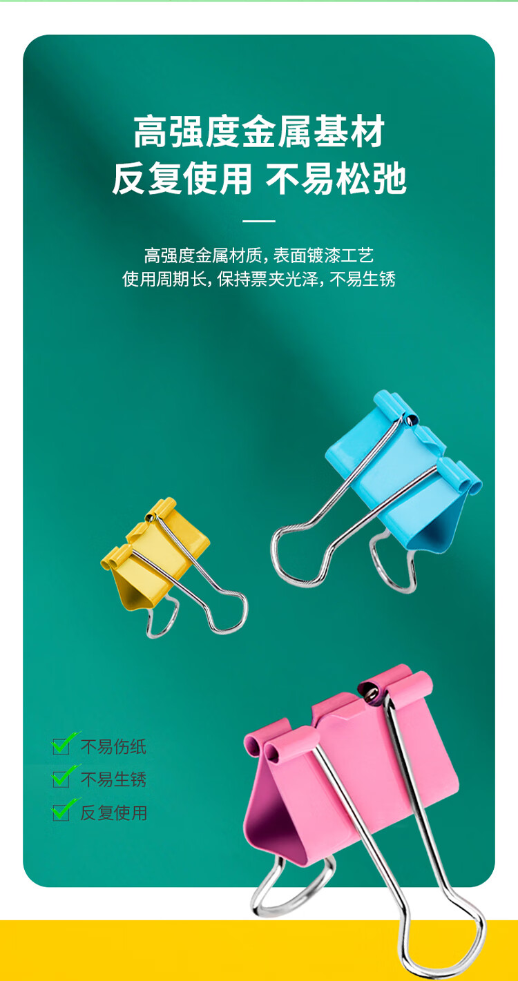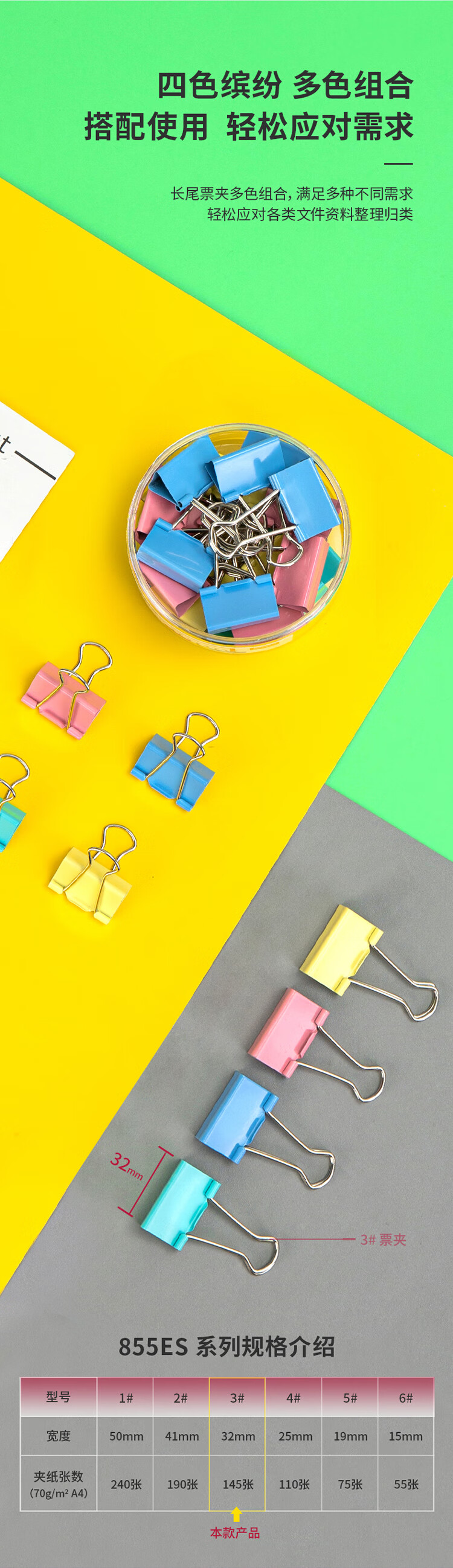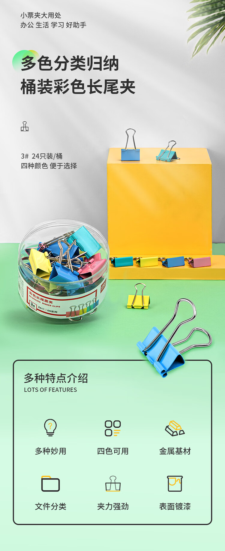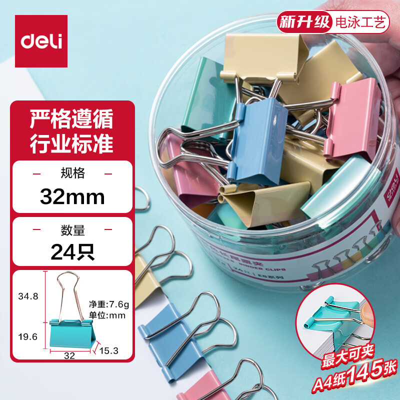 得力(deli) 8553ES 长尾夹 24只32mm彩色长尾夹票夹 3#中号金属燕尾夹票据文件夹子 24只/筒
