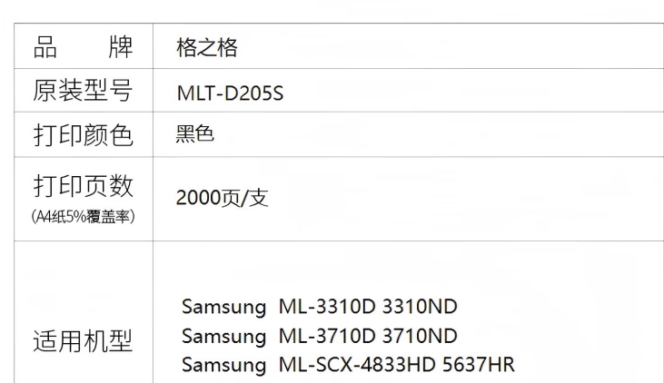 >格之格 MLT-D205S 硒鼓 黑 2000页 适用SamsungIML-3310D 3310ND ML-3710D 3710ND 1710DN ML-SCX-4833HD 5637HR
