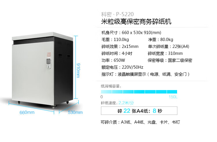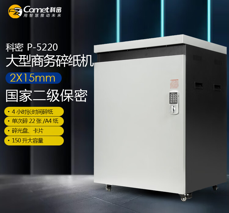 >科密 (comet) P-5220 碎纸机 国家保密认证二级 2*15毫米 22张/次 150L保密商用碎纸机大吞吐(碎卡光盘240分钟)
