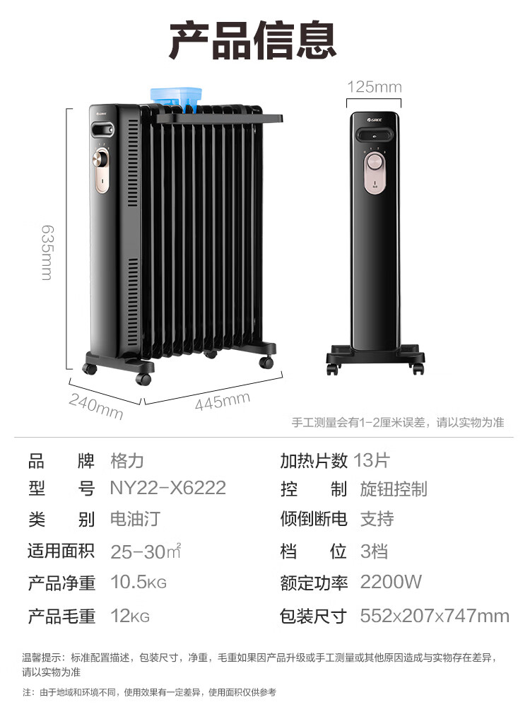 格力(GREE)取暖器 NY22-X6222 电油汀取暖器 家用大面积 油汀发热取暖机 客厅卧室大功率电暖气片 可移动加湿暖衣电热油丁电暖器 13片 机械式