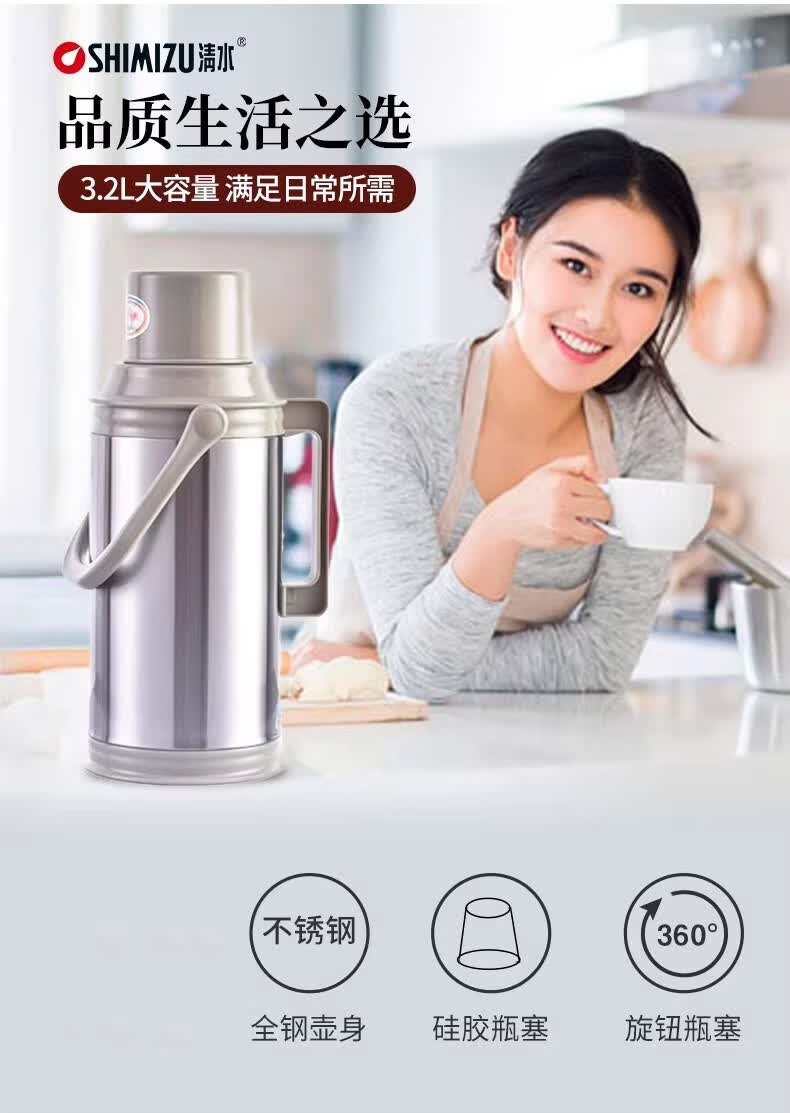 >清水 壶 3072 经典暖瓶 保温壶 不锈钢暖壶 家用玻璃内胆 保温瓶 办公保温 热水瓶 3.2L 砂光灰
