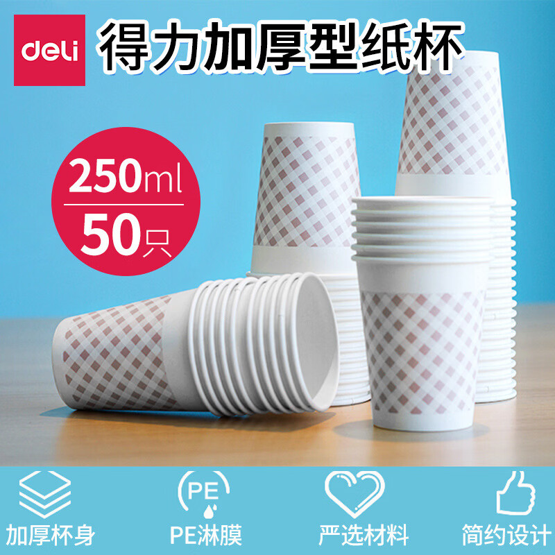 得力 一次性杯子 9570 家用办公室喝水杯子 年货咖啡杯 茶杯 9570 网格纸杯 250ml 50个